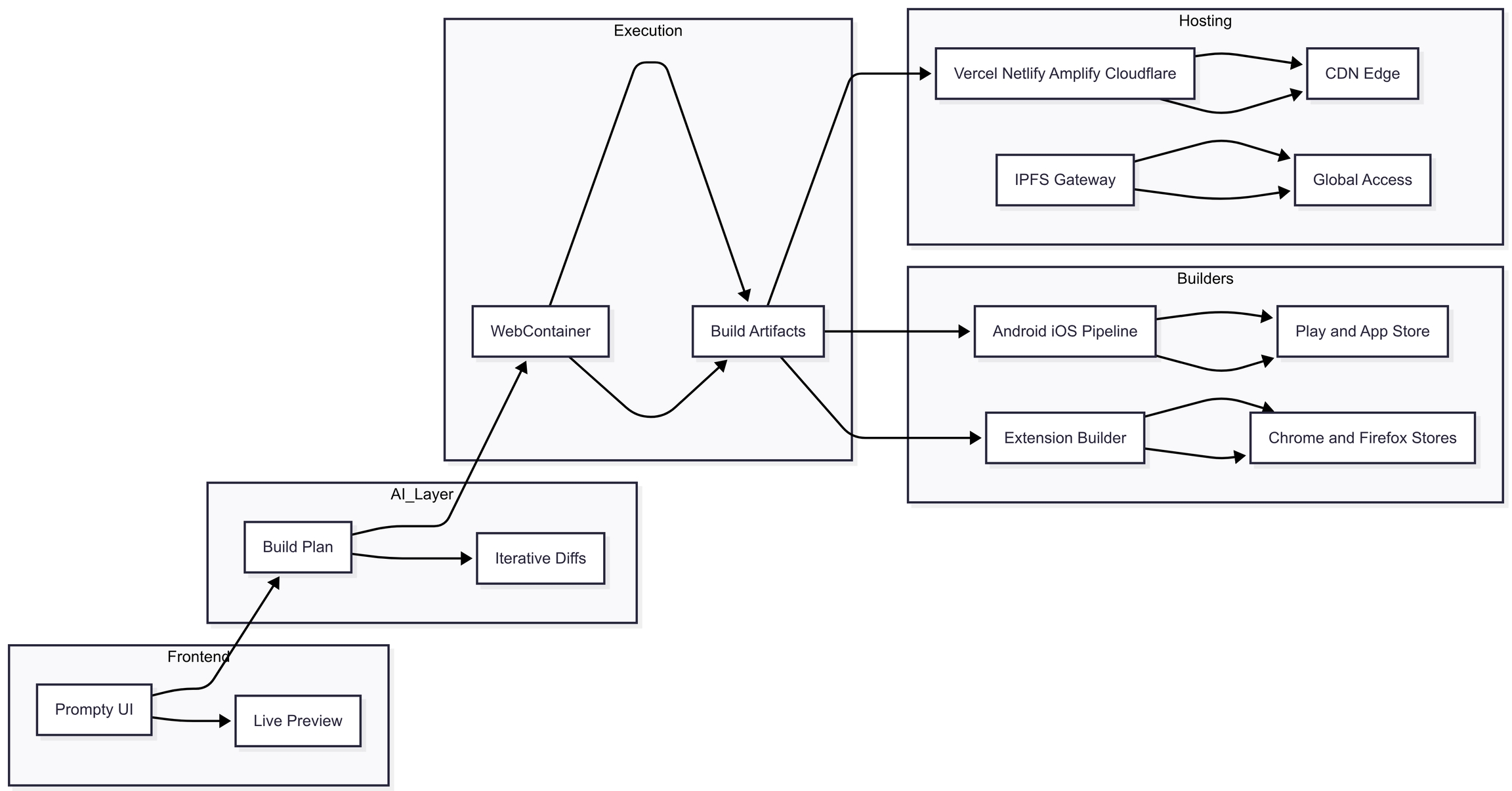 Projects compile within WebContainer; artifacts upload to Vercel, Netlify, AWS Amplify, or Cloudflare Pages with automatic domain and SSL configuration.
