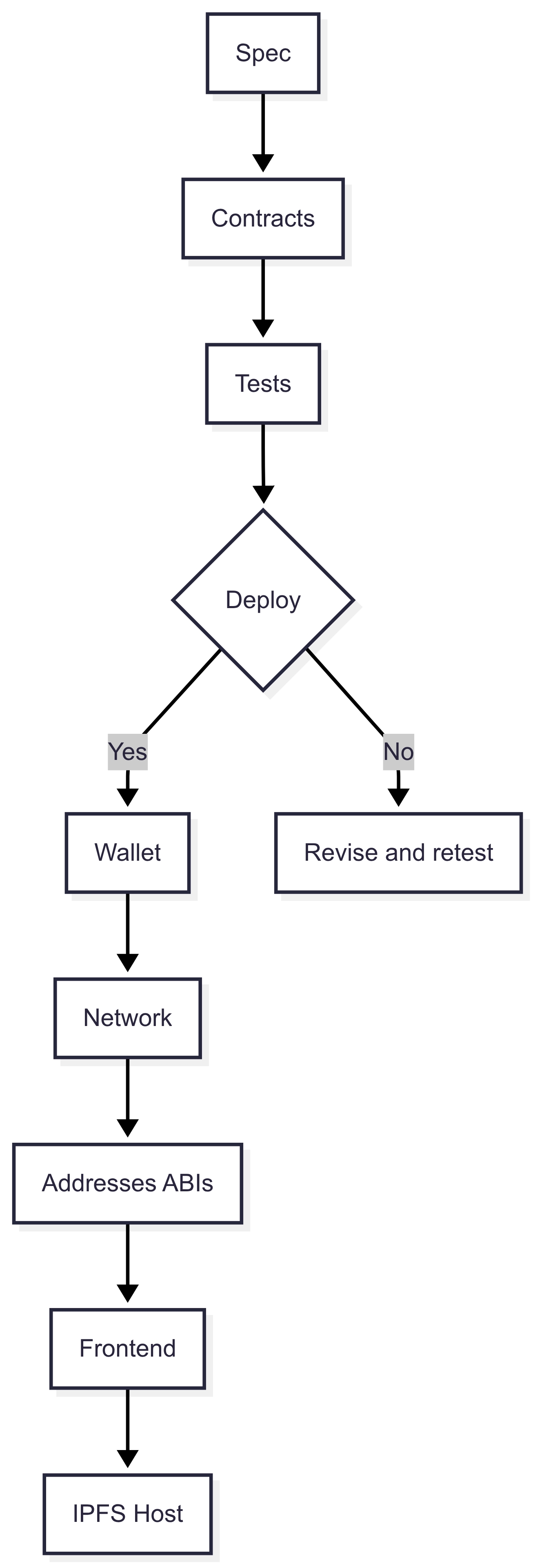 Solidity compilation via integrated tools, deployment to EVM networks, frontend to IPFS with pinning services.