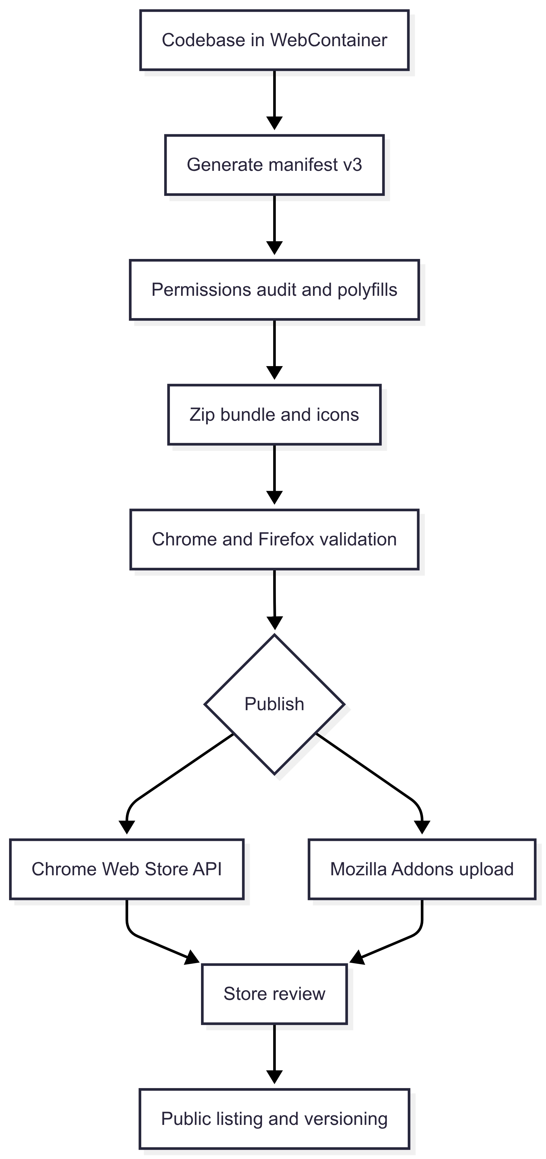 Automatic Manifest v3 generation, lint checks, compatibility tests, direct upload to Chrome Web Store or Mozilla Add-ons.